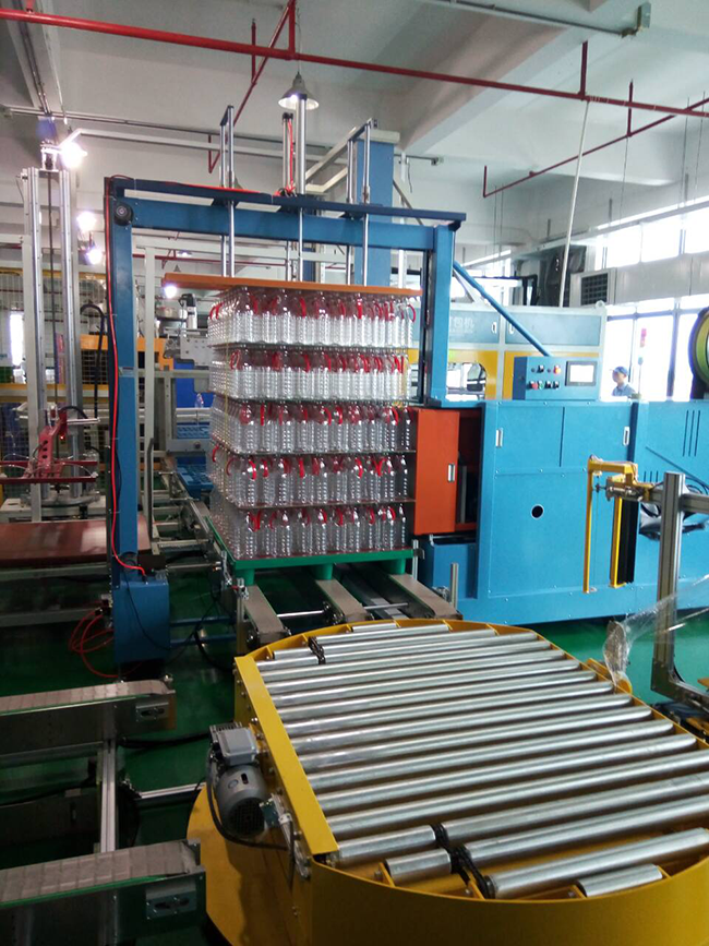 開放式弓架活動的穿帶能將棧板與捆包物牢固地捆包在一起便于移動及運輸,堆滿產品的棧板通過輸送滾筒線可實現無人化捆包生產線。