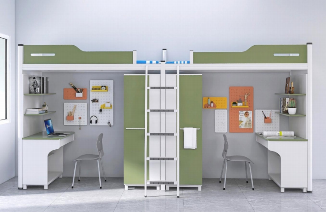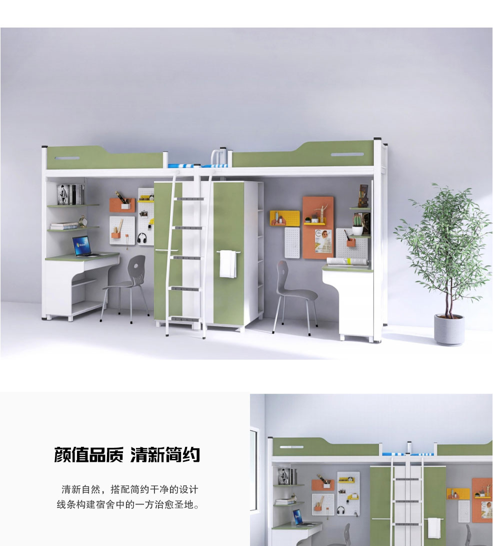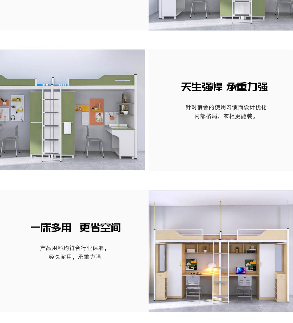 二連3人位公寓床1.整體規格:L4110*W900*H2120mm/2900mm,;2.邊立柱:采用(V65閉口型材),料厚1.2mm的閉口型管材,立面8個。立柱上下兩端口安裝工程塑料靜音內塞,上端內塞...